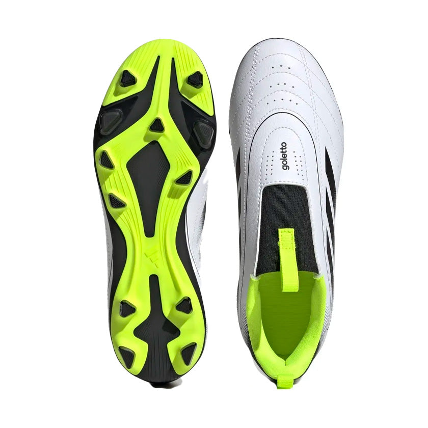 Ponte estos tacos adidas Goletto IX para jóvenes y prepárate para brillar en la cancha. Su exterior sintético suave incorpora acolchado y perforaciones en los lugares adecuados para mantenerte cómodo en todo momento. El antepié sin cordones te ofrece una mayor zona de golpeo, mientras que la suela flexible garantiza velocidad y estabilidad en canchas de terreno firme y pasto sintético.