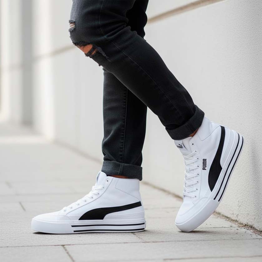 Luce un estilo urbano y versátil con estos tenis Puma Court Classic Vulc Mid FS. Su diseño tipo botín en color blanco con detalles en negro es perfecto para quienes buscan un calzado que combine con todo y ofrezca comodidad durante todo el día. Ideales para un look casual con un toque deportivo.