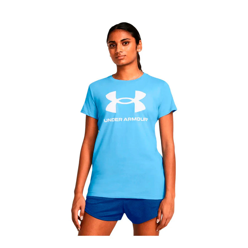 La playera Under Armour Logo SS está diseñada para mujeres que buscan comodidad y rendimiento durante sus entrenamientos. Su diseño en color azul ofrece un estilo deportivo limpio y versátil, ideal para gimnasio, running o actividades físicas. Es una prenda ligera que permite mantener frescura y libertad de movimiento en cada rutina.