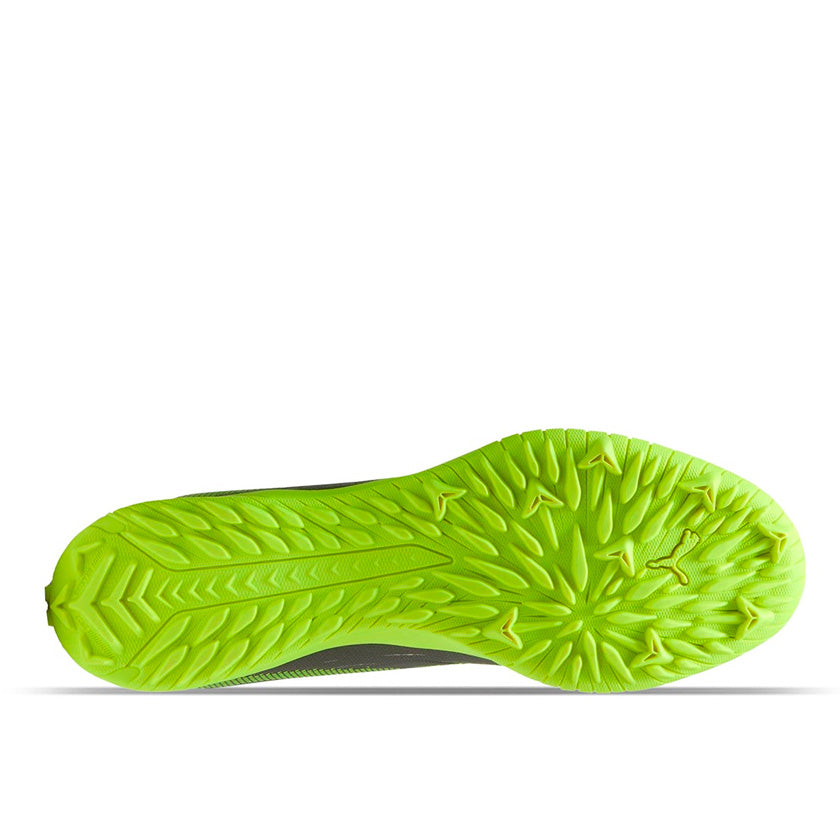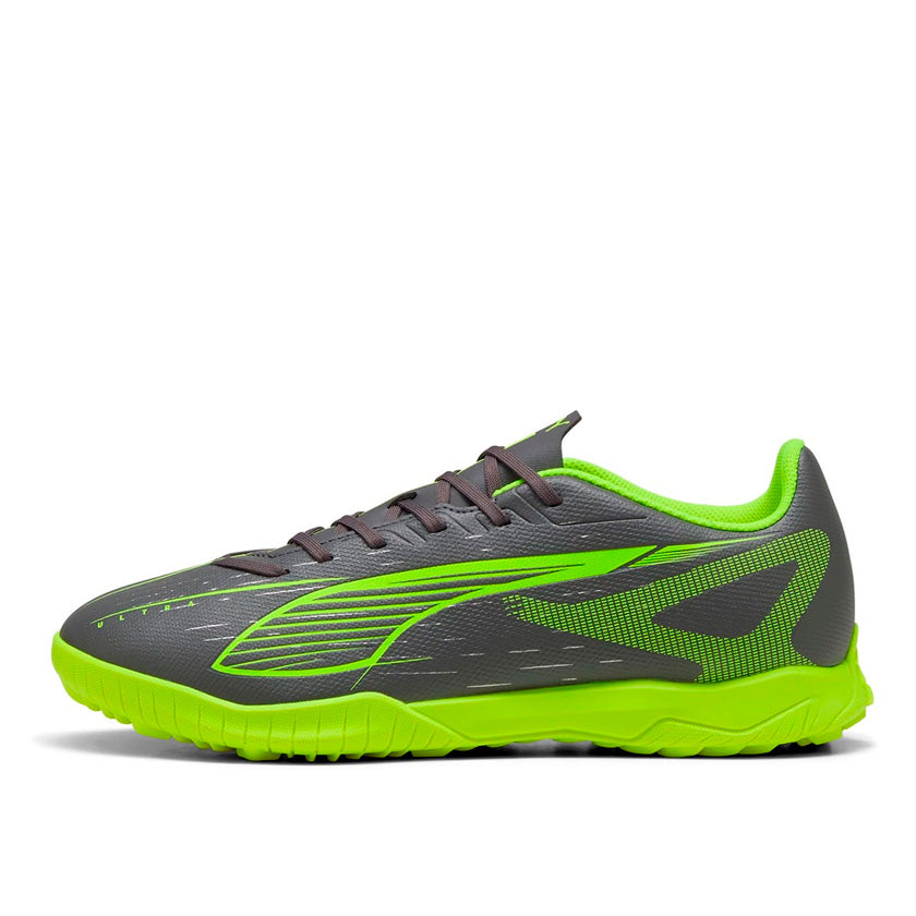 Puma Ultra 5 Play TT Off 108331 03 son tachones tipo turf indoor para fútbol soccer diseñados para hombre que buscan combinación de estilo atrevido, rendimiento y agarre confiable. Su color gris con toques en verde neón les da un look moderno y enérgico, perfectos para destacar en canchas de pasto sintético o superficies tipo turf.